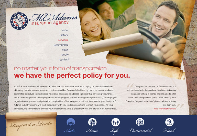 This website was developed for ME Adams Insurance after their logo was completed. The design utilized elements to keep a historical document look and feel while maintaining the color scheme from the logo itself.
